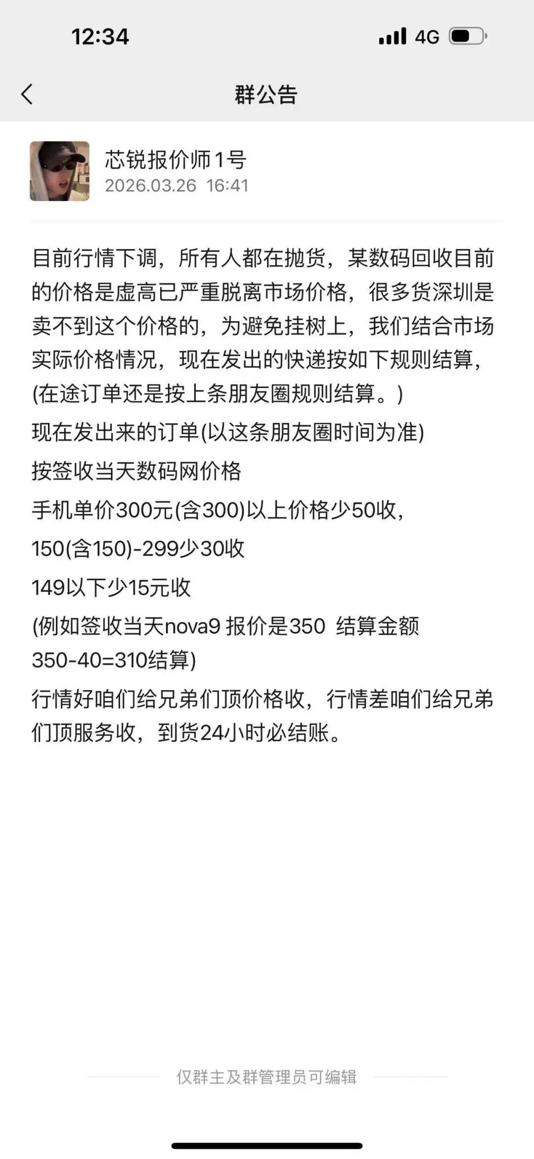 一位回收商在微信群里发通知,目前二手手机回收价下调;图片来源:微信群