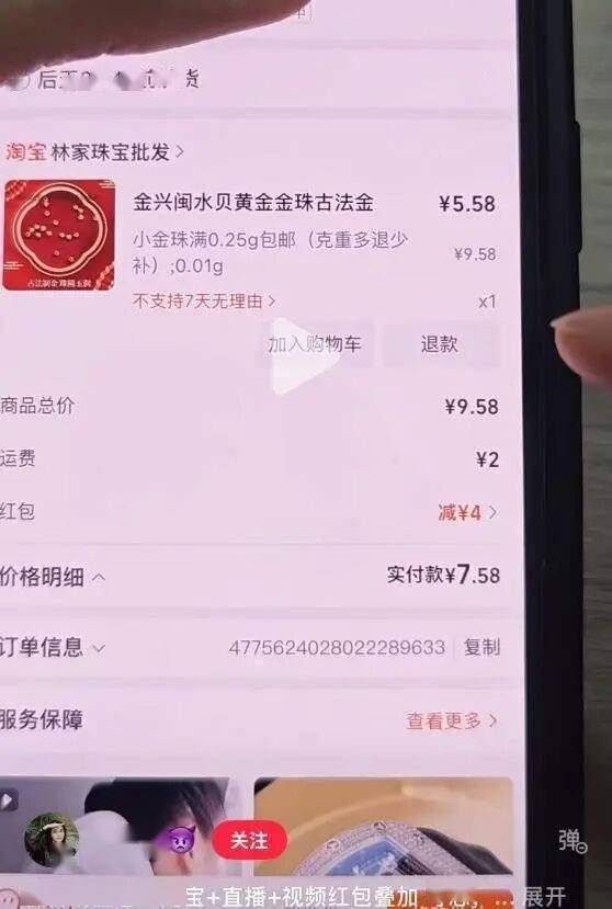 有网友表示,自己在购物平台通过叠加视频红包、蹲守直播间,可以以个位数的低价购入最少0.01克金珠。