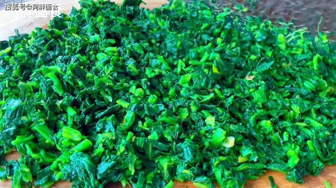 2、菠菜焯水后,捞出立刻放凉水里,过一会儿再稍微挤水,不用挤太干。若是挤的太干,后面和面还需要再加水。最后把菠菜切碎即可。