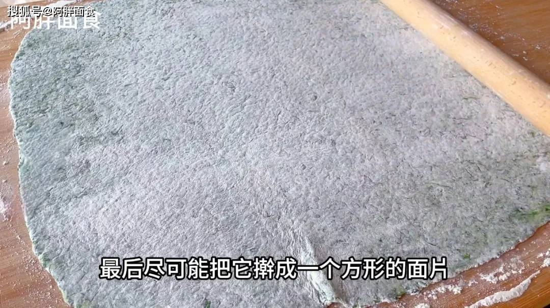 6、这一步开始擀开面团。取出家中最长的擀面杖,把菠菜面团擀开。若是面团粘案板了,记得撒入干面粉防粘即可。面片的厚度,差不多1毫米多一点,看清楚,是“毫米”哦!