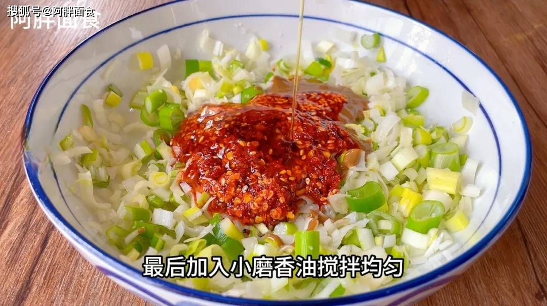 5、再准备一点大葱,切成葱花。想吃辣的,就加一点辣椒油,不喜欢辣的不加。最后加入盐、十三香、芝麻香油搅拌均匀。