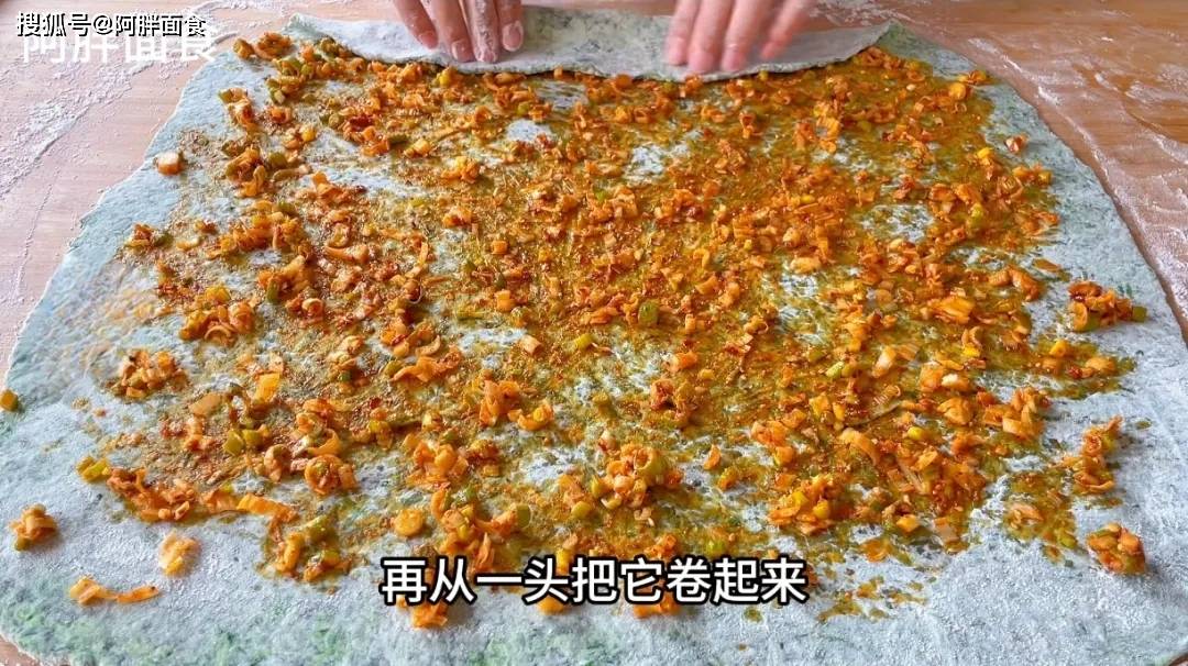 7、然后撒上腌好的葱花,并均匀铺在面片上。接着从一头卷起,卷的宽度,不要太窄,卷宽一点更容易熟。