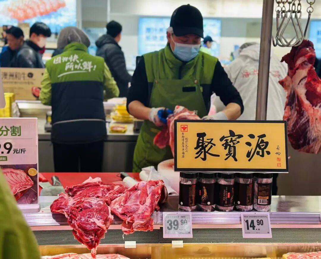 即有美食市集的体验和场景,又构建了水产与肉禽区的免费加工服务(如鲜肉制肉馅、切片/卷,整禽切块等),甚至设置面食细加工间、熟食加工间——线上难以落地的体验和服务。丰富细致的服务提示和免费水饮、以及销售人员亲切的态度,很有“胖东来”式的服务体感。
