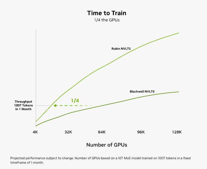 不过看数据,Rubin 还是相当能打的,在主力 Vera Rubin NVL72 机柜中,单机架能塞进 72 颗 Rubin GPU + 36 颗 Vera CPU,训练 MoE 模型只需上一代 Blackwell 的 1/4 GPU 算力,效率飞升,而且已经量产,预计是下半年出货。